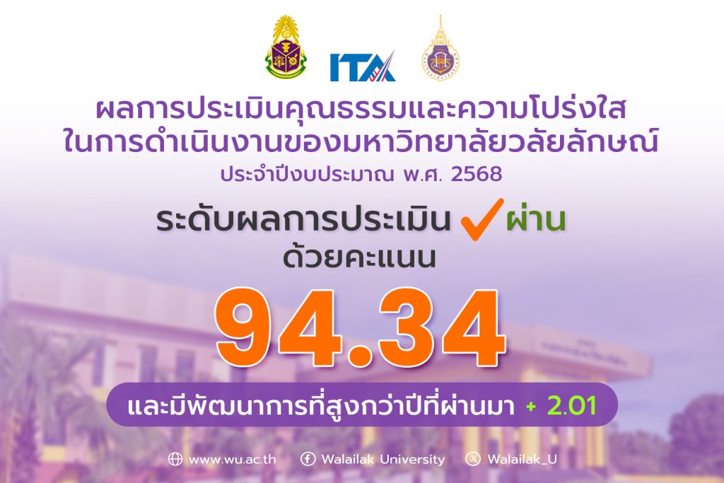 มหาวิทยาลัยวลัยลักษณ์ ได้รับผลการประเมิน ITA ประจำปีงบประมาณ พ.ศ. 2568 ด้วยคะแนน 94.34 คะแนน สูงกว่าปีที่ผ่านมา + 2.01คะแนน อยู่ในลำดับที่ 28 ของหน่วยงานประเภทสถาบันอุดมศึกษา